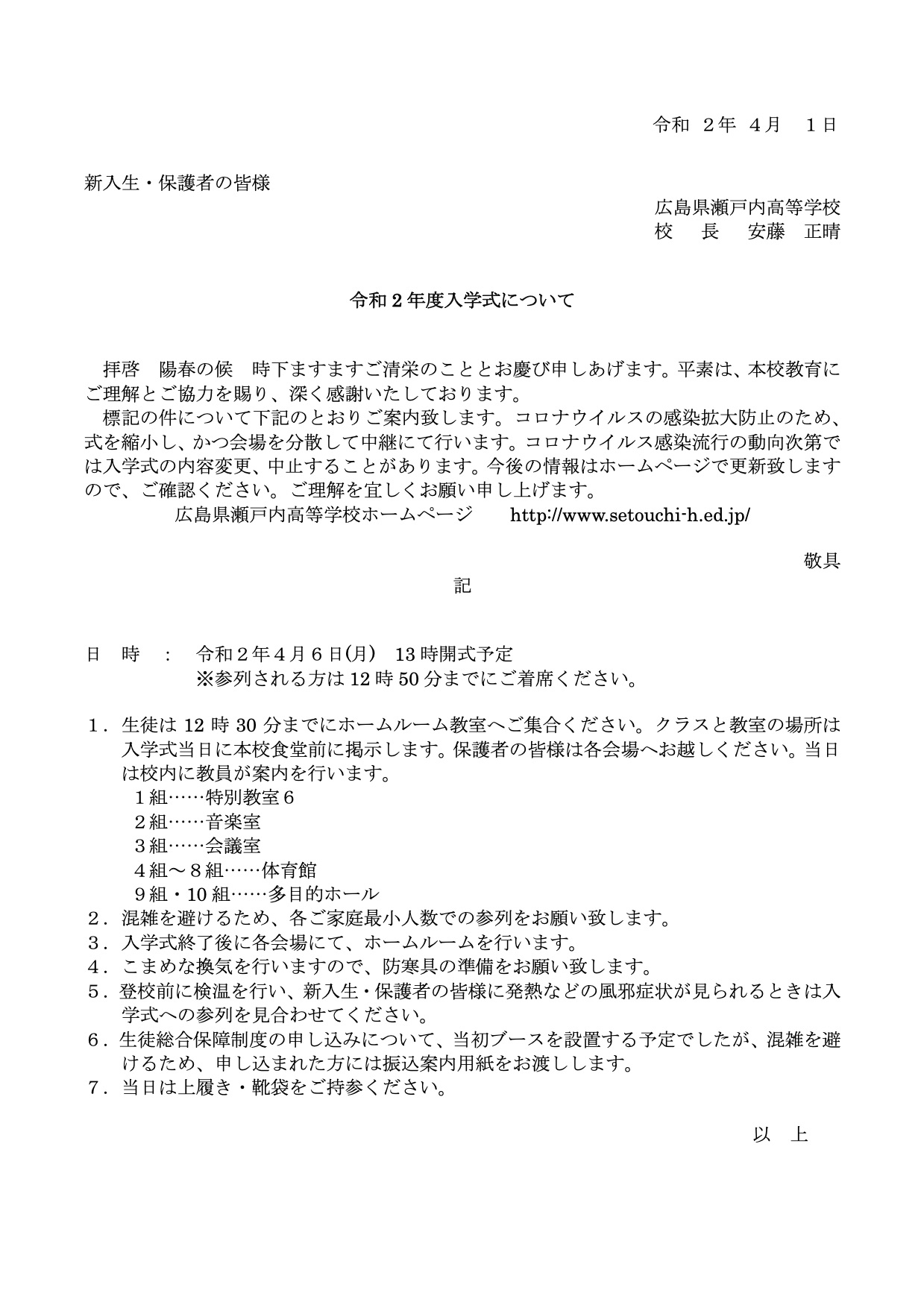 > 令和2年度入学式について
